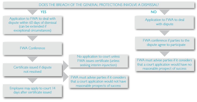 Two separate processes apply to dealing with contraventions of the general protections. The process to deal with a breach will depend on whether or not the breach has resulted in a dismissal of an employee. The chart below outlines the processes.