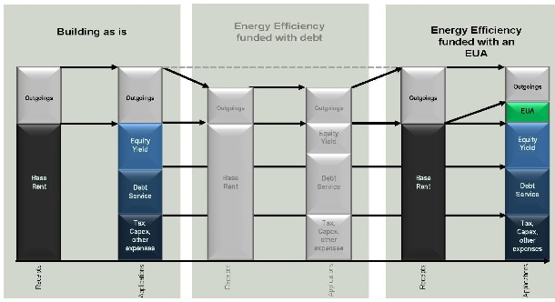 • the potential drag on equity returns that may result if the costs of the EUA exceed the amount that can be passed through to tenants (but bearing in mind that this drag will almost certainly be less than under traditional debt or equity financing);