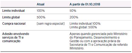- Aprovações especiais para a contratação, via adesão, de serviços de tecnologia da informação e comunicação — a adesão, nesses casos, só poderá ocorrer quanto a ata de registro de preços for gerenciada (i.) pelo Ministério do Planejamento, Desenvolvimento e Gestão; ou (ii.) por outro órgão ou entidade, desde que previamente aprovada pela Secretaria de Tecnologia da Informação e Comunicação de referido Ministério.