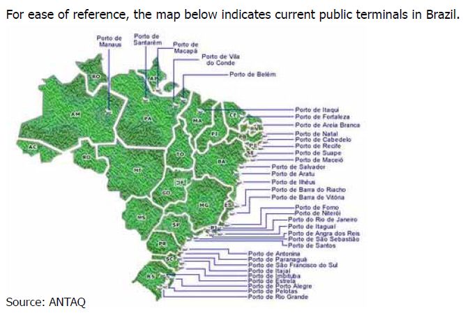 The Brazilian National Agency for Waterway Transportation ("ANTAQ") recently announced that terminals in the port of Santos, State of Sao Paulo, and ports in the State of Pará will be the first block of terminals to be put to bid in 2013 under the new Ports Law (Law No. 12,815/2013) of June 5, 2013. The bid documents are expected to be issued by October, and bids may occur before the end of the year.