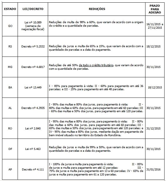 Além destes, diversos outros Estados estão com programas de anistia e parcelamento de débitos em curso. A fim de alertá-los quanto aos prazos e benefícios, preparamos o quadro abaixo que relaciona as reduções e os prazos para adesão, com destaque para os Estados cuja adesão se encerra no final do mês de novembro: