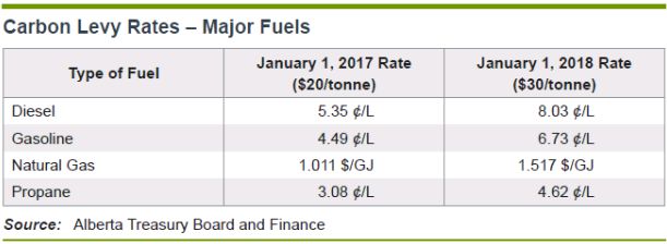 As noted above, the carbon levy will be included in the price of all fuels that produce GHG emissions when combusted. These include transportation and heating fuels such as diesel, gasoline, natural gas and propane. However it will not apply directly to consumer purchases of electricity. Starting January 1, 2017, the carbon levy will be applied to fuels at a rate of $20/tonne. In 2018, the levy will increase to $30/tonne. The rates for each type of fuel are set out in the table below: