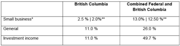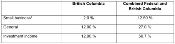 The general corporate income tax rate will be increased by 1% from 11% to 12% effective January 1, 2018. British Columbia's corporate income tax rates for 2017 and for 2018 are as follows: