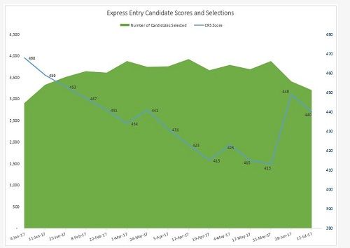 July 12, 2017- Today, the Department of Immigration, Refugees and Citizenship Canada (IRCC) invited 3202 people to apply for Permanent Residence to Canada through Express Entry. The number of invitations issued decreased by 207 invitations from the last draw on June 28, 2017. The Comprehensive Ranking System (CRS) score was 440, a slight drop of 9 points from the last draw. This is the second draw since improvements to the Express Entry system that came into force on June 6, 2017.