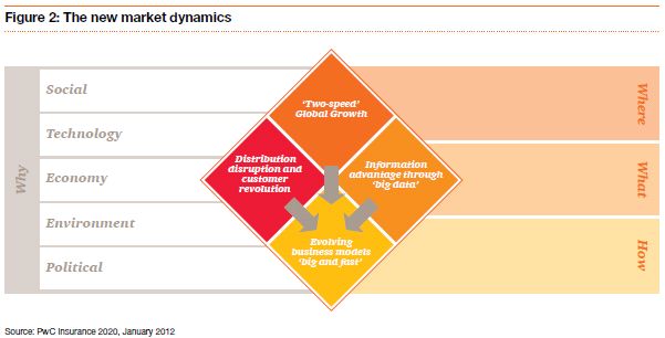In this article, we examine the developments that are set to have the most decisive impact over the next five years and the main opportunities for innovation, growth and competitive differentiation. This includes how to deal with the shifting focus of growth ('two-speed' global growth), changes in customer preferences (distribution disruption and the customer revolution), sharper profiling (information advantage through 'big data') and new competitive threats (evolving business models 'big and fast'). The aim is to help life and pensions companies assess the implications of a marketplace in transformation for their particular organization.