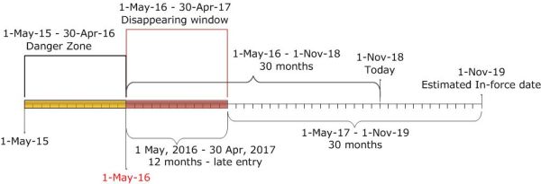 If the new Patent Rules come into force on November 1, 2019, then the highlighted window (May 1, 2016 to April 30, 2017 in the illustrated example) may disappear, depending on what transitional provisions are provided. Accordingly, an international application having a priority date (or if no priority is claimed, then a filing date) that is earlier than May 1, 2017 may not be able to enter national phase in Canada after the hypothetical in-force date November 1, 2019 without satisfying the new requirements. Similarly all applications filed after the date that is 42 months prior to the in-force date may have their window of entry into the national phase significantly shortened.
