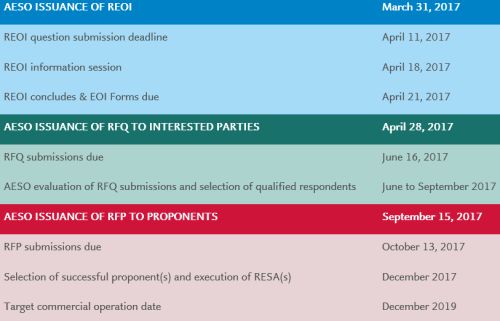 Proponents will be able to submit questions to the AESO regarding the REP until April 11, 2017, with an information session to follow on April 18, 2017. Proponents must submit their EOI Form in response to the REOI by April 21, 2017. The RFQ will be issued to proponents that respond to the REOI on April 28, 2017. The REOI stage is non-binding; submission of an EOI Form does not obligate a proponent to continue to participate in the RFQ stage.