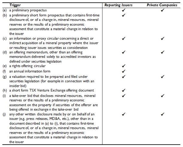One of the most important public documents produced by a mining issuer in Canada is the "technical report." A technical report must be filed by both private and public companies for material mineral projects when "triggered" by National Instrument 43-101 Standards of Disclosure for Mineral Projects (NI 43-101). Therefore, it is very important for every mining issuer to be aware of these triggers, so as to not trigger a technical report when it is not in a position to file a technical report prepared in accordance with NI 43-101.