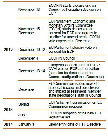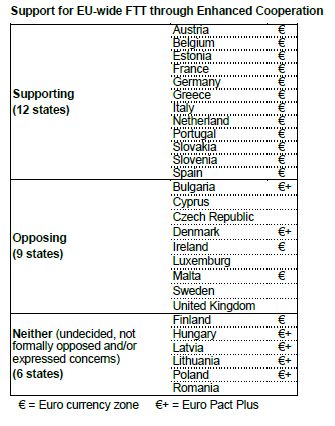 The Commission's proposal, submitted on October 23, 2012, would allow 11 member states to introduce the FTT via Enhanced Cooperation (Austria, Belgium, Estonia, France, Germany, Greece, Italy, Spain, Portugal, Slovakia and Slovenia). In June, the European Council urged that a decision be made by December.