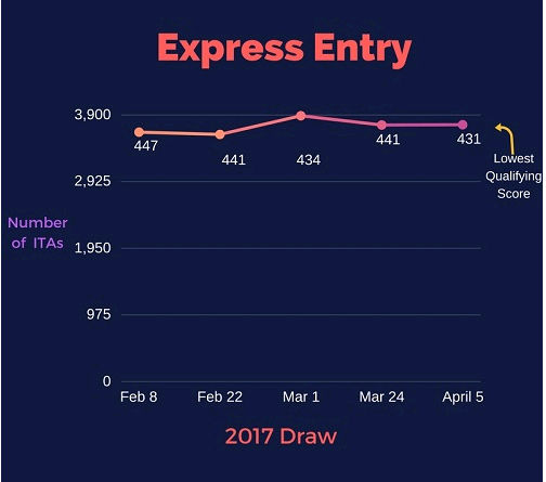 April 5, 2017- Today, the Department of Immigration, Refugees and Citizenship Canada (IRCC) invited 3,753 people to apply for Permanent Residence to Canada through Express Entry. The number of invitations increased slightly by 4 invitations from the last draw on March 24, 2017. This draw also set a new minimum Comprehensive Ranking System (CRS) score of 431, a drop of 10 points from the last round. Candidates in the Express Entry pool with a CRS score of 431 are now in a position to submit an application for Canadian permanent residence.