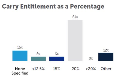 20% remains by far the most common carried interest percentage, typically arising after a preferred return hurdle of 8% has been passed.