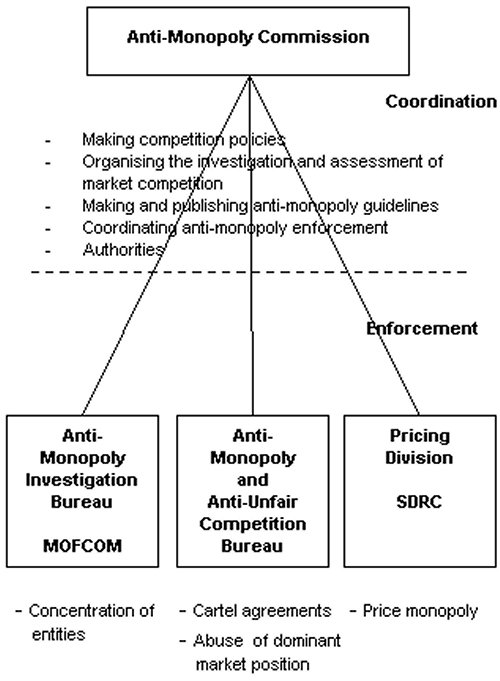 Although some other countries have designated a single government agency to control monopolistic practices, the PRC government has divided this responsibility among four agencies. The structure of the its anti-monopoly organisation is depicted below.