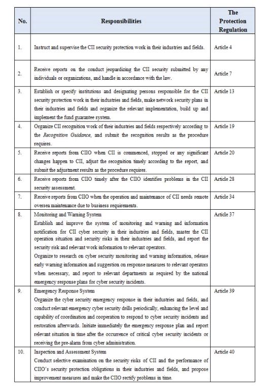 To instruct enterprises more explicitly, according to Article19 of the Protection Regulation, the national cyberspace administration will make a Guidance on the Recognition of Critical Information Infrastructure(关键信息基础设施识别指南) (the "Recognition Guidance") together with the telecommunication administration of the State Council, public security departments and other relevant authorities. The national industry administration or supervision departments of the CII, i.e. Ministry of Industry and Information Technology for telecom industry, National Development and Reform Commission and National Energy Administration for energy industry, shall organize the CII recognition work of their industries and fields respectively according to the Recognition Guidance, and submit the recognition results as the procedure requires. Based on these provisions, we believe it is the responsibility of the administration or supervision departments of each industrial sector and field to identify CII.