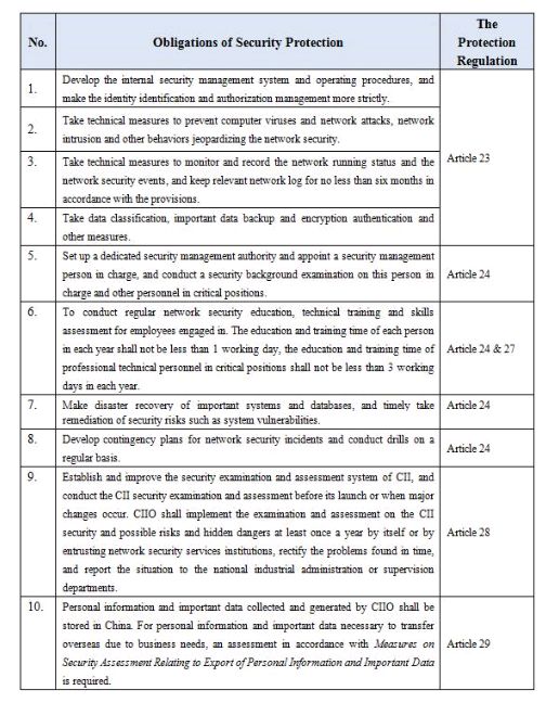 Pursuant to the provisions of the Protection Regulation, the CIIO shall perform the following security protection obligations in accordance with the mandatory requirements of the network security grade protection system and the relevant national standards.