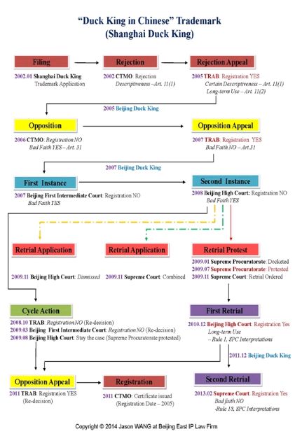The case has lasted for more than eleven years, from the application date in January 2002 to February 2013 when the SPC rendered the retrial decision. When the CTMO issued the trademark registration certificate in 2011 for the "Duck King in Chinese" trademark of Shanghai Duck King, the registration date of such trademark registration certificate is 2005, and six years has already passed.