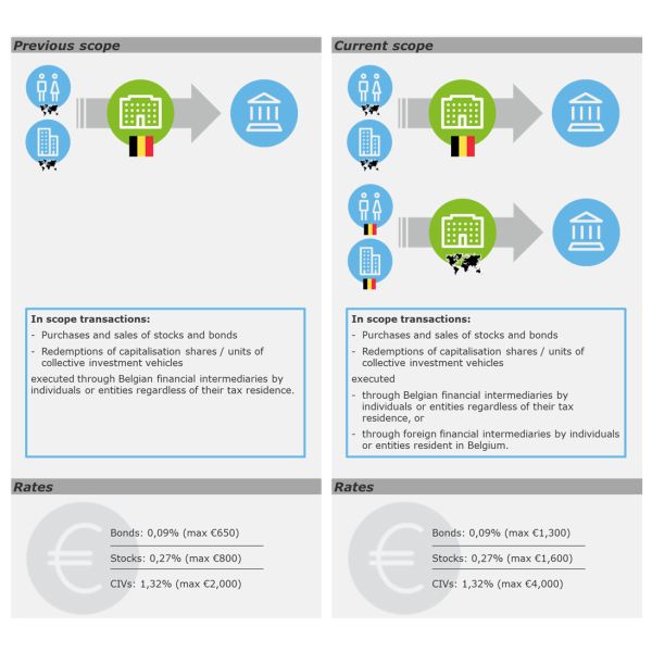 The new regime, applicable as of 1 January 2017, expands the scope to cover transactions executed by Belgian residents (individuals and entities) outside of Belgium. As an example, a transaction executed through a Luxembourg bank or broker by a Belgian tax resident is now subject to the Belgian stock exchange tax.