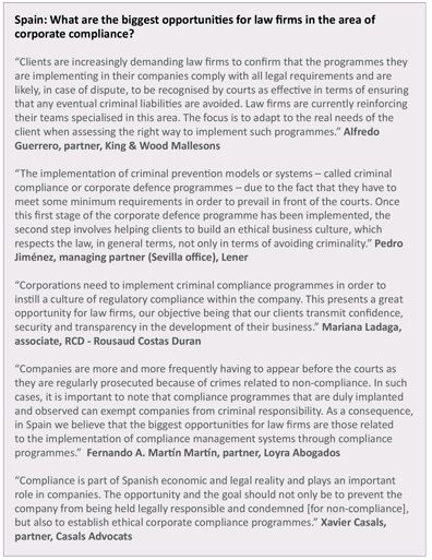 There are still many companies – even among the largest market players – that have, as yet, failed to fully get to grips with the issue of compliance. And even among those that are taking the issue seriously, lawyers report that many are starting from scratch in terms of developing compliance programmes. While this suggests that law firms have an opportunity to cash in on what is a relatively untapped market, the problem remains that many businesses in Iberia are still not completely convinced of the need to be compliant. This is despite the fact that they are running the risk of severely damaging their reputation, or even worse, going out of business altogether.