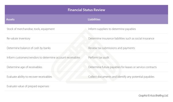 Other items that may need to be reviewed are capital contribution, cash on hand, cash flows and any other key financial indicators.