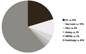 5 ISS und Glass Lewis veröffentlichen weder ihre Empfehlungen noch die Berichte; Ethos und SWIPRA veröffentlichen ihre Empfehlungen, nicht aber die Berichte, kurz vor, zRating direkt nach der jeweiligen Generalversammlung.