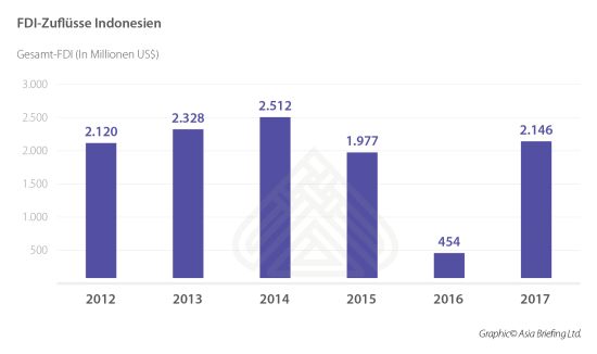 Rangierend auf Platz 30 des Market Potential Index repräsentiert Indonesien einen großen Verbrauchermarkt, welcher für deutsche Produkte zunehmend attraktiver wird. Aufgrund internationaler und lokaler Faktoren sanken FDI-Flüsse nach Indonesien in den letzten Jahren geringfügig. Mit deutschen Investitionen im Wert von 268 Millionen USD zeigte sich 2017 jedoch bereits eine leichte Verbesserung.