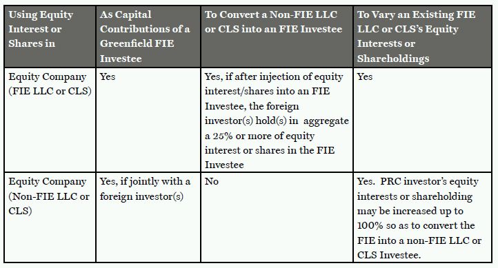The Draft Measures permit capital contribution by foreign and/or domestic investors using equity interests they hold in a limited liability company ("LLC") or shares in a company limited by shares ("CLS") in the PRC ("Equity Company"), whether being a foreign-invested enterprise ("FIE") or a non-FIE company, into an FIE ("Investee") in the following situations: