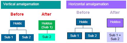 There are two types of court-free amalgamations: vertical and horizontal. A vertical amalgamation is between a holding company and one or more of its wholly-owned subsidiaries, whereas a horizontal amalgamation is between two or more subsidiaries of the same holding company. In a vertical amalgamation, the shares of the amalgamating subsidiary will be cancelled and in a horizontal amalgamation, the shares of all but one of the amalgamating subsidiaries will be cancelled. The following diagram illustrates a vertical and a horizontal amalgamation: