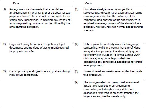 In view of the above, it is important to consider the commercial reasons, local tax implications and foreign legal and tax implications when deciding how to streamline businesses. A high-level summary of the potential pros and cons of court-free amalgamations, compared to normal asset transfers, is provided in the Appendix to this article.