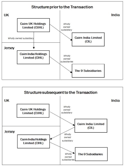 Cairn India Holdings Limited ("CIHL") was incorporated in Jersey in August, 2006 as a wholly owned subsidiary of Cairn UK Holdings Limited ("CUHL" / "Taxpayer"), a holding company incorporated in the United Kingdom in June, 2006. Under a share exchange agreement between CUHL and CIHL, the former transferred shares constituting the entire issued share capital of nine subsidiaries of the Cairn group, held directly and indirectly by CUHL, that were engaged in the oil and gas sector in India ("Subsidiaries"). Thereafter, Cairn India Limited ("CIL") was incorporated in India in August, 2006 as a wholly owned subsidiary of CUHL. By way of a subscription and share purchase agreement and a share purchase deed, shares constituting the entire issued share capital of CIHL were transferred to CIL ("Transaction"), the consideration for which was partly in cash and partly in the form of shares of CIL. CIL then divested 30.5% of its shareholding by way of an Initial Public Offering ("IPO"). As a result of divesting Approx. 30% of its stake in the Subsidiaries and part of IPO proceeds, CUHL received Approx. INR 6101 Crore (Approx. USD 931 Million).
