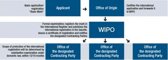 A: Once you submit your application to the Trade Mark Registry, the Registry will review and certify your application and then submit it to the WIPO. Next, the WIPO does a formality check of the international trademark registration. If there are no issues, then the mark is registered and published in the WIPO gazette. The mark is then forwarded to the Designated Contracting Parties i.e. the countries where you want your trademark to be registered.