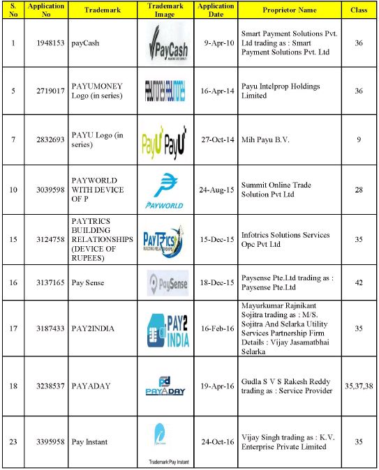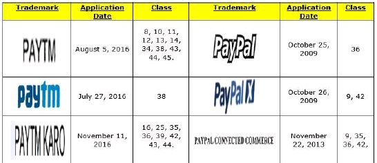 For the ease of convenience of our readers, we have listed below in tabular form the important trademarks filed by both PayPal and Paytm at the Trademarks Registry, and a comparison of the same -