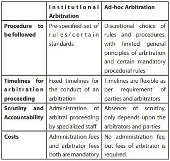 What is an institutional arbitration? It is a procedure where arbitral proceeding is undertaken according to a set of rules and administered by a particular arbitration institution, whereas, an ad-hoc arbitration proceeding provides liberty to parties to decide the rules to govern their own arbitration proceeding and to appoint arbitrator of their choice. Following are key difference between both the procedures: