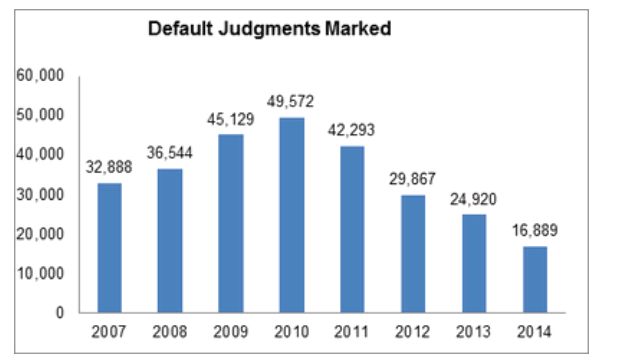 The table below shows the number of default judgments, marked in the District, Circuit and High Courts, obtained by creditors against debtors. It indicates that such judgments peaked in 2010. Numbers then dropped steadily in the following years, down from almost 50,000 in 2010 to fewer than 15,000 in 2014. Given this figure includes those issued in all of the three above-mentioned courts, the 2014 jurisdiction changes cannot be said to distort it. When figures are released for 2015, we expect they will show that the reduction in debt recovery proceedings is continuing.