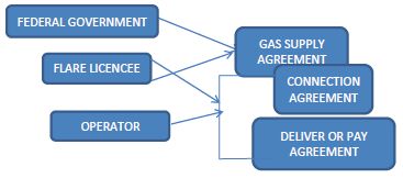 The commercial framework to underpin the programme as depicted below, forsees an agreement between the Federal Government and the Flare Permit holder (Flare Licencee) for the sale of contracted Flare Gas volumes to the Flare Licencee - Gas Supply Agreement; an agreement in respect of the connection of the respective facilities of the Operator and the Flare Licencee- Connection Agreement; and an agreement between the Operator and the Flare Licencee under which the Operator guarantees to supply an agreed volume of flared gas to a Flare Licencee - Deliver or Pay Agreement