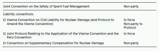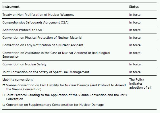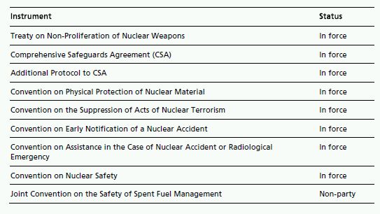 The table below shows the status of the adoption of international nuclear instruments in the UAE.