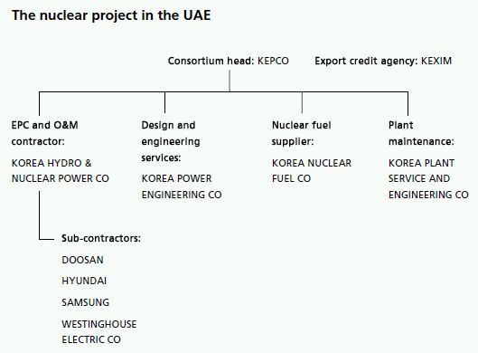 - Prime contractor – the KEPCO-led prime contractor is backed by a consortium of the key nuclear power companies in South Korea. Financing is to be provided by the South Korean Export Credit Agency, KEXIM.