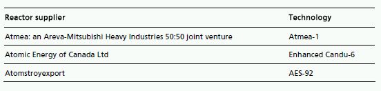 Three reactor vendors and designs were shortlisted in May 2010, as shown in the table below.