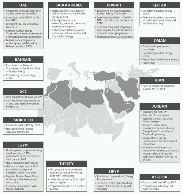 Nuclear power is increasingly being seen as the energy of the future. Most established nuclear markets have considerable nuclear new build plans. Recent statistics from the International Atomic Energy Agency (IAEA) indicate that 60 states have expressed an interest in or are actively planning to introduce nuclear power.1 Almost every state in the Middle East and North Africa (MENA) region is included on this list.
