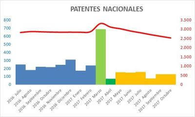 4 Cuando hay un cambio normativo de calado, como lo sido la entra en vigor de la nueva ley de patentes el pasado 1 de abril de2017, se suelen "exprimir" al máximo los últimos coletazos de la ley conocida y se recela de la nueva, aumentando mucho las solicitudes en el último mes y cayendo en el siguiente. Luego los meses siguientes deberían reflejar la actividad normal de la nueva normativa.