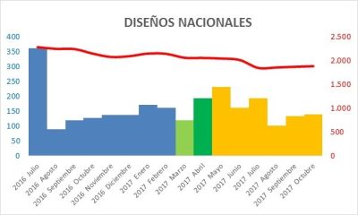 Solicitudes mensuales de diseños españoles, en rojo evolución interanual, en verde claro el mes anterior a la entra en vigor de la Nueva Ley de Patente, en oscuro el posterior