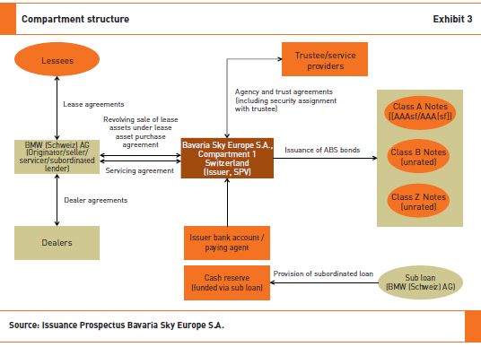 The third Swiss auto lease ABS is a public term compartment transaction of BMW (Schweiz) AG with notes partially listed on SIX. A portfolio of auto lease assets originated by BMW was transferred to Bavarian Sky Europe S.A. (the BMW Issuer Swisscard), a limited liability SPV incorporated under the laws of Luxembourg. The BMW Issuer issued asset-backed CHF220.5m Class A Compartment 1 Fixed Rate Notes, CHF57.9m Class B Compartment 1 Fixed Rate Notes and CHF21.6m Class Z Compartment 1 Fixed Rate Notes via a separate compartment within the meaning of the Luxembourg Securitisation Law. The Class A Compartment 1 Notes, which are listed on SIX, rank senior to the Class B Compartment 1 Notes and the Class Z Compartment 1 Notes, while the Class B Compartment 1 Notes rank senior to the Class Z Compartment 1 Notes.