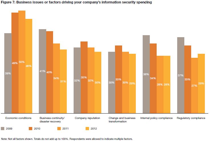 What business issues or factors drive security spending? We saw a wide range of responses on this issue, but the most frequently cited answers did not concern the business value of good information security. In fact, economic conditions are by far the largest driver of security spending, cited by 46% of respondents. That's a lower percentage than 2011 and 2010.