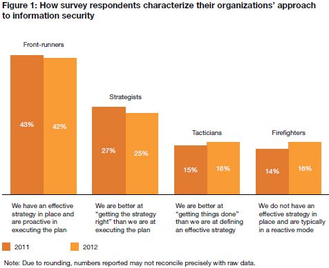 We've categorized respondents according to the way they describe their approaches to security. Frontrunners (42%) say their organization has "an effective strategy in place is proactive in executing the plan." These are key elements of true security leadership. Strategists (25%) say they are "better at 'getting the strategy right' than executing the plan," while tacticians (16%) rate themselves "better at 'getting things done' than at defining an effective strategy." Firefighters (16%) admit that they "do not have an effective strategy in place and are typically in a reactive mode."