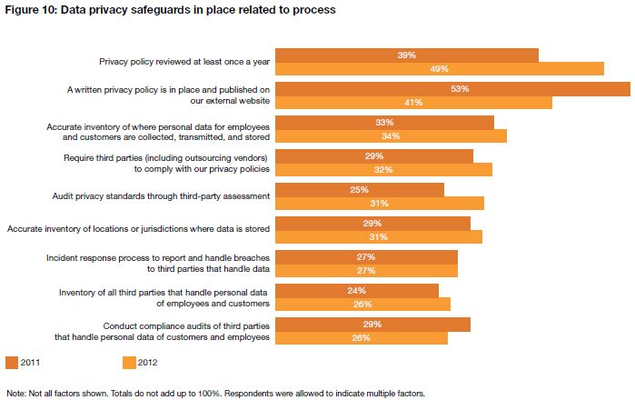 The way people work with others also reflects a general lack of real commitment to security. Most organizations lack an incident-response process to report and handle breaches at third parties that handle data, and fewer than one-third require third parties (including outsourcing vendors) to comply with their privacy policies. Furthermore, fewer than half (44%) of respondents say their firms collect, retain, and access only as much personal customer information as is necessary to conduct their business. The rest, presumably, collect more customer information than they actually use.