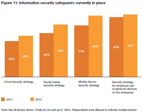 In this context, it comes as no surprise to find an increase in the number of organizations with safeguards in place for mobile, social media, and cloud computing, along with policies covering the use of employee-owned devices. But these numbers remain stubbornly low: Just 44% have a mobile security strategy, while strategies for the cloud and social media clock in at less than 40% and lag the adoption rates of the technologies themselves.