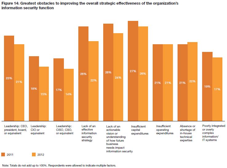 We asked respondents to name the most significant barriers to improving the overall strategic effectiveness of the information security function. Many of the respondents point to the top: More than one in five name the CEO, board, or equivalent, while another 15% single out the CIO and 14% cite senior security officers. Added together, more than half of respondents say top-level leadership is the greatest obstacle to improving information security effectiveness—a larger number than any single category, including insufficient capital and operating funds, lack of strategy, and a shortage of skilled workers.