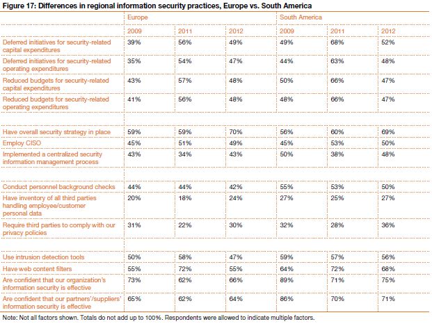 The surge of investment comes as tough economic times were beginning to deplete the region's security arsenal. Now South American respondents are at or near the top of global rankings for confidence in security culture and the effectiveness of security activities. In terms of privacy and security technologies, South America tends to outscore Europe and in some cases has surpassed North America.