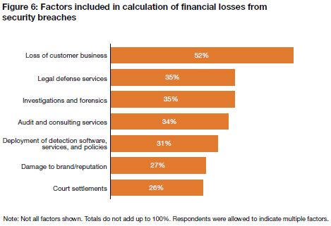 These numbers seem encouraging, yet there's a catch: Many organizations do not perform a thorough appraisal of the factors that might contribute to such losses. For example, barely one-quarter considered damage to brand and reputation when estimating the full impact of a security breach, and just over half considered loss of customer business. This is significant because protecting data is essential to customer loyalty. In fact, a recent PwC consumer survey found that 61% of respondents would stop using a company's products or services after a breach.1