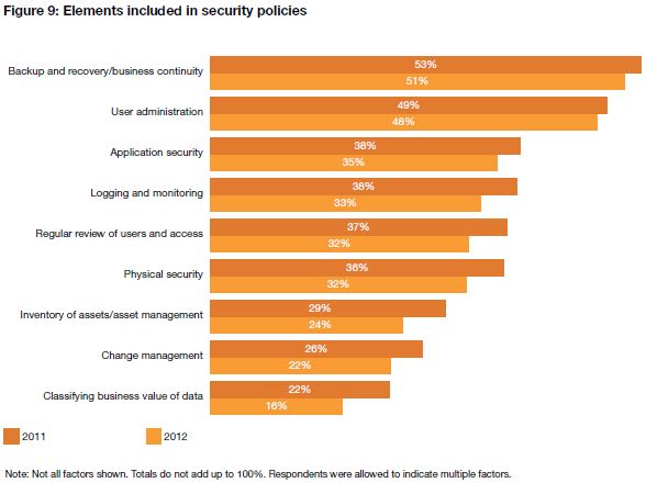 Concurrent with the emptying of information security toolboxes has been a relaxation of the policies that set standards across the enterprise. Many fundamental elements of security policy have dwindled—sometimes sharply—over the past several years. Take, for example, policies defining backup and recovery / business continuity, which only 51% of respondents say remain in place at their organizations. The list goes on: User administration, application security, physical security, and management practices like segregation of duties have all seen declines.