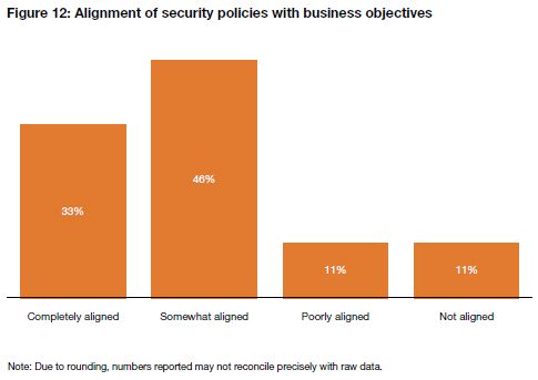 The value of even the boldest strategies and plushest budgets should be measured against their alignment with the goals of the larger organization. By that standard, most respondents believe their security efforts are well-targeted, with one third saying security policies are completely aligned with business goals. Another 46% say they are somewhat aligned. Just over one in five respondents say strategies are poorly aligned or not aligned.