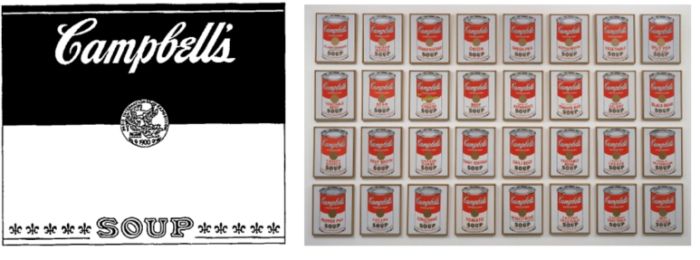 W kontekście omawianego zagadnienia inaczej należy spojrzeć na dzieła sztuki współczesnej, które wymykają się często dotychczasowym definicjom przekazu artystycznego. Jako przykład warto wskazać serię obrazów zatytułowanych Puszki z zupą firmy Campbell" autorstwa Andy'ego Warhola, które przedstawiają opakowania zupy, po którą zresztą sam artysta nierzadko ponoć sięgał do obiadu. Trzydzieści dwie puszki zostały przez Warhola przedstawione jedna obok drugiej, tworząc typowy dla jego stylu artystycznego efekt multiplikacji głównego elementu obrazu. Nie dziwi zatem fakt, że pierwowzór etykiety umieszczanej na puszkach zup marki Campbell's został zarejestrowany jako unijny znak towarowy wg EUTM-000272914.